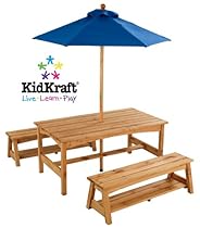 The Kidkraft Kids Outdoor Table and Benches with Blue Umbrella is a great choice for outdoor snack time craft time dinner time and more! These kid-sized table and benches are constructed of weather-resistant Sanmu wood for years of continued use. Each outdoor furniture piece features a sturdy construction making it a safe choice for families with multiple children. A beautiful blue umbrella is included to protect your child from harsh UV rays. Liven up your patio with this outdoor table and bench set from Kidkraft!